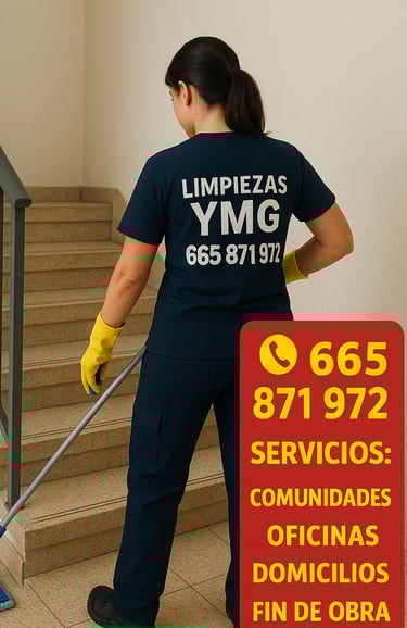 Contamos con un equipo comprometido, eficiente y con experiencia, que trabaja con la máxima responsabilidad y atención al detalle. En YMG Limpiezas creemos que cada cliente es único, por eso ofrecemos soluciones adaptadas a tus necesidades, cuidando tanto de tu espacio como de tu tiempo.
